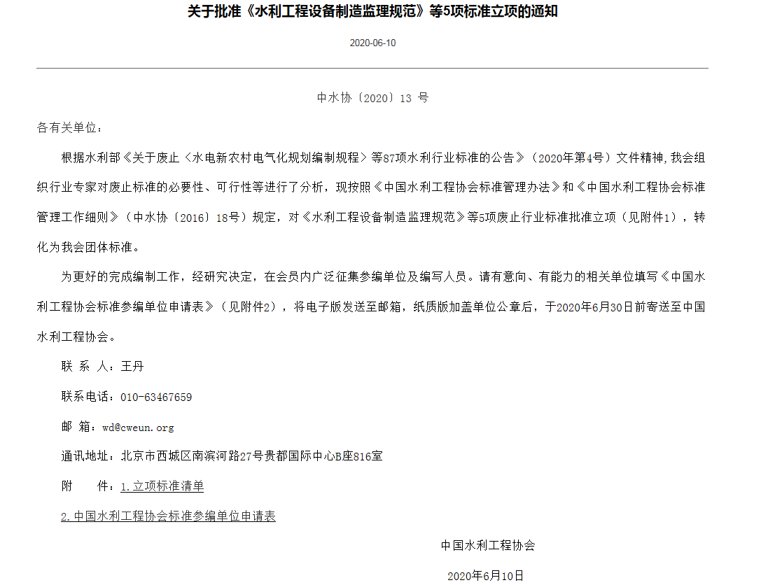 關于批準《水利工程設備制造監理規范》等5項標準立項的通知