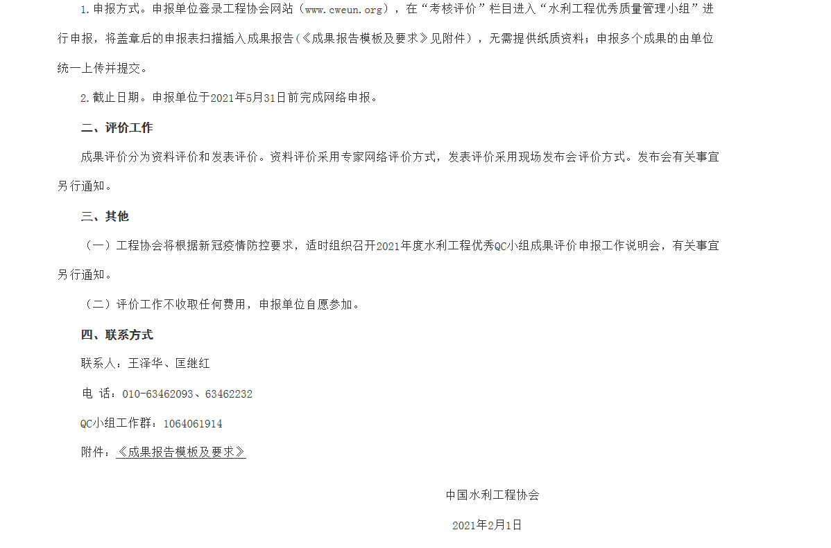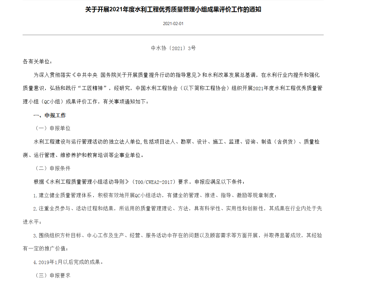 關于開展2021年度水利工程優秀質量管理小組成果評價工作的通知